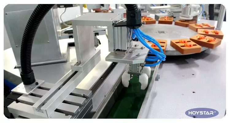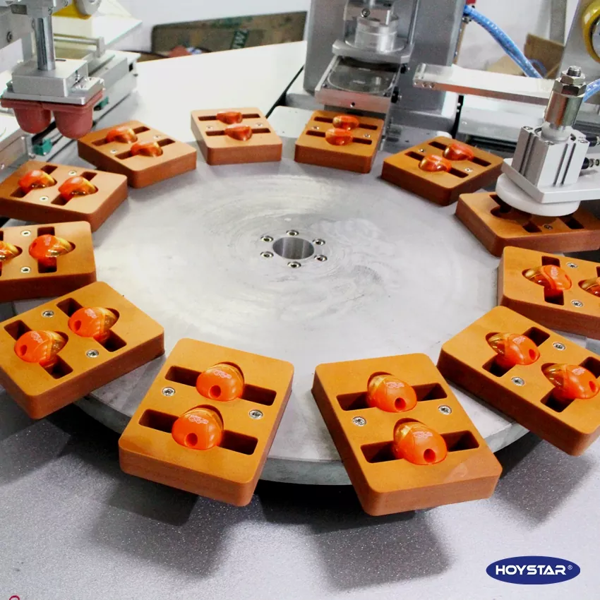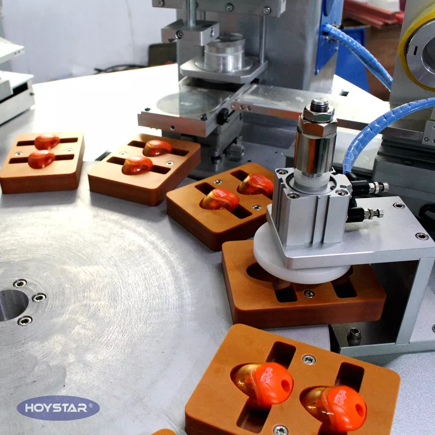 این چاپگر 2 رنگ خودکار HOYSTAR با نوار نقاله مخصوص چاپ بر روی گیره های اندازه طراحی شده است. به عنوان یک ماشین سفارشی غیر استاندارد، در یک چرخه نیمه اتوماتیک ظاهر می شود: بارگیری دستی و به دنبال آن چاپ خودکار، تمیز کردن خودکار پد، خشک کردن خودکار، و تخلیه خودکار. ، دستگاه مجهز به PLC و کنترل صفحه لمسی برای عملکرد بصری، هر پیشرفت چاپ را می توان روی صفحه لمسی کنترل کرد.